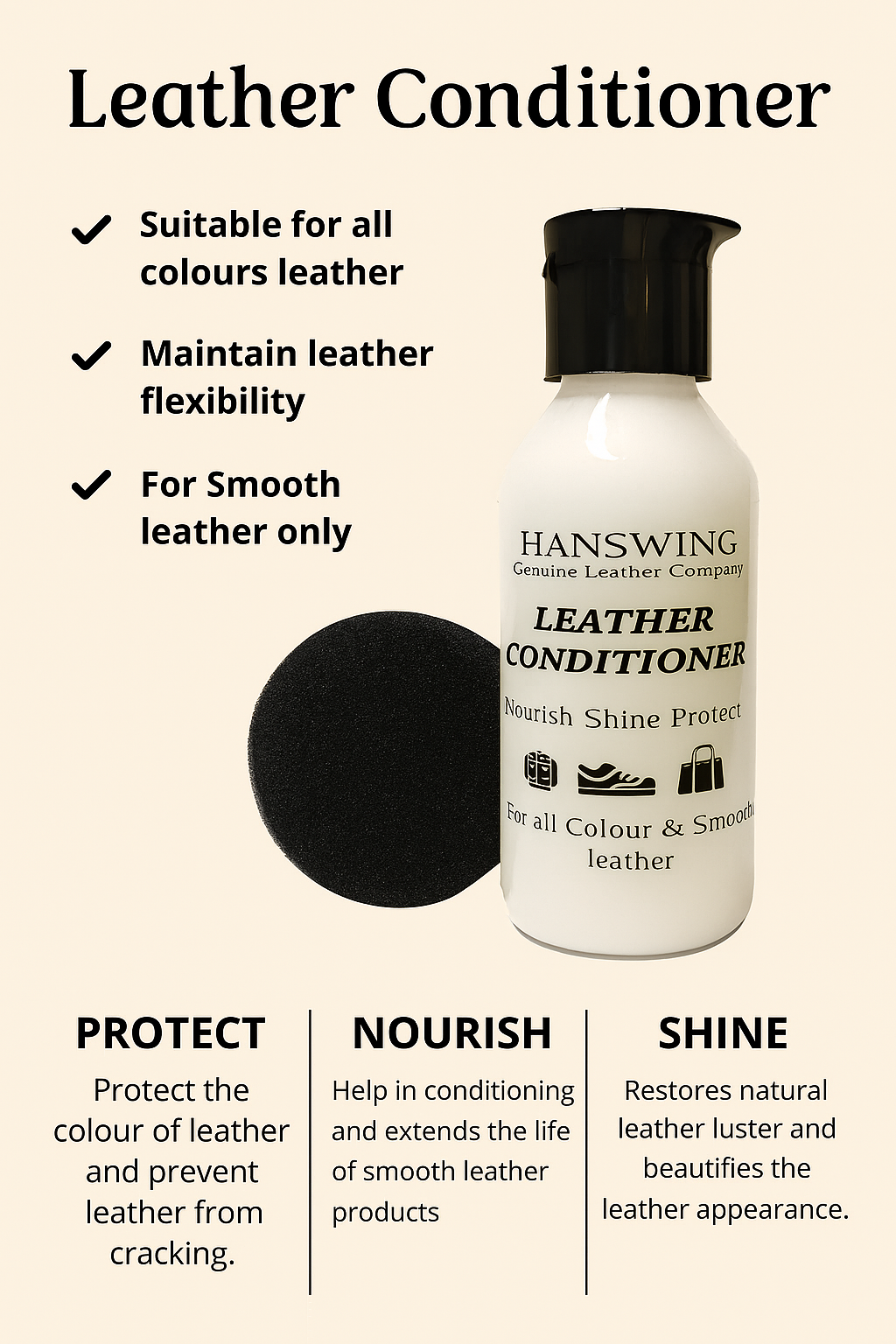 + Free ShippingLeather moisturizers are designed to keep leather products like shoes, bags, and furniture in good condition. Here are some key features you might find in a Hanswing leather moisturizer: Conditioning: Moisturizers help to replenish the natural oils in leather, keeping it supple and preventing it from drying out and cracking. Protection: Many leather moisturizers offer some level of protection against water and stains, helping to preserve the leather’s appearance and durability. Restoration: They can help restore the leather’s natural luster and color, making it look fresh and new. Non-Greasy Formula: A good moisturizer should absorb well without leaving a greasy residue, ensuring that the leather remains clean and comfortable to use. pH-Balanced: Leather is sensitive to pH levels, so a pH-balanced moisturizer helps to maintain the leather’s natural condition without causing damage. Ease of Use: Many moisturizers come with easy-to-apply formulas, such as creams, sprays, or gels, making the application process straightforward.